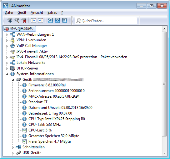 LANmonitor bietet Ihnen die Möglichkeit, die CPU- und Speicherauslastung eines Gerätes über SNMP abzufragen und anzuzeigen. Öffnen Sie dazu den Menübaum eines Gerätes, wechseln Sie in die System-Informationen und öffnen den Zweig Gerät: ….