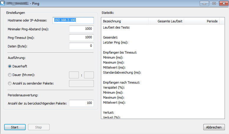 Anmerkung: Die Abstände zwischen zwei Pings können nicht kleiner sein als die Paketlaufzeit, d. h. vor Versenden eines Pings muss der vorherige Ping beantwortet oder der Ping-Timeout abgelaufen sein.