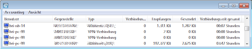 Sie können sich die Accounting-Informationen von einem bestimmten Gerät anzeigen lassen. Mit den Accounting-Informationen werden die Verbindungen der einzelnen Stationen im LAN zu den erreichbaren Gegenstellen im WAN protokolliert. Dabei werden folgende Detailinformationen erfasst:
