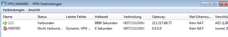 Sie können sich die VPN-Verbindungen von einem bestimmten Gerät anzeigen lassen. In der Liste der VPN-Verbindungen werden die letzten 100 VPN-Verbindungen protokolliert. Dabei werden folgende Detailinformationen erfasst: