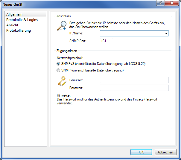 Anmerkung: Für den reinen Lesezugriff ist die Angabe einer Read-Only-Community anstelle eines Administratorkontos die bevorzugte Wahl, da SNMP-Pakete bei SNMPv2 im Klartext übertragen werden.