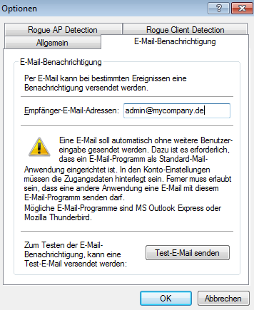 Anmerkung: Für die Alarmierung per E‑Mail muss auf dem Rechner, auf dem der WLANmonitor läuft,