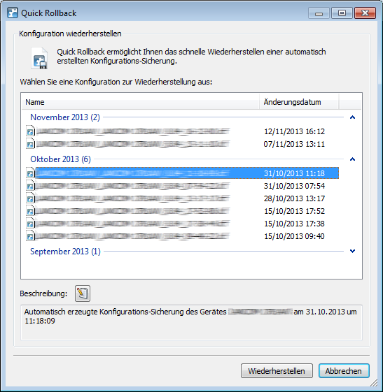 Um eine Konfigurationssicherung wiederherzustellen, markieren Sie einen Eintrag und klicken auf Wiederherstellen.