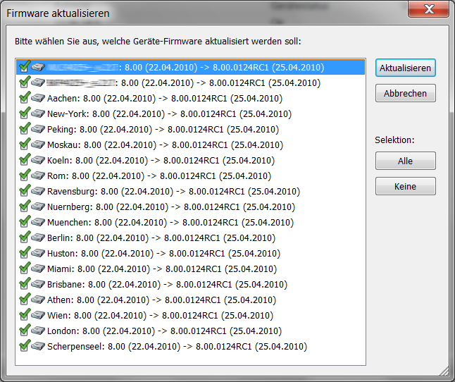 Wenn bei der Suche im Archiv keine neueren Firmware-Versionen gefunden wurden, können Sie alternativ die komplette Liste alle gefundenen Firmware-Dateien ansehen. So können Sie u. a. auch auf ältere Versionen zurückschalten. LANconfig zeigt alle gefundenen Versionen für alle markierten Geräte an, dabei auch den aktuellen Versionsstand der Geräte. Für jedes Gerät können Sie genau eine Firmware-Version auswählen, die dann in das Gerät eingespielt wird.