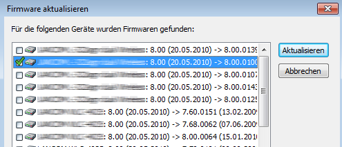 Für die manuelle Suche nach Firmware-Updates klicken Sie mit der rechten Maustaste auf einen markierten Eintrag in der Geräteliste und wählen im Kontextmenü den Punkt . Wenn Sie mehrere Geräte markiert haben, erscheint der Punkt Nach Firmware-Updates suchen direkt im Kontextmenü.
