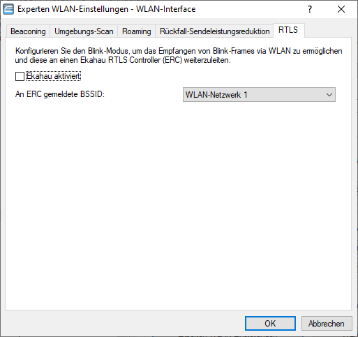- Wählen Sie hier die logische WLAN-Schnittstelle aus, die das Gerät an den ERC melden soll. Der ERC hat diese BSSID mit einem Ort "gemappt" (z. B. Serverraum) und weiß entsprechend, dass z. B. Wi‑Fi Tag "A" sich in diesem Moment im Serverraum befindet, wenn der "Blink" über die BSSID des entsprechenden APs hereinkommt.