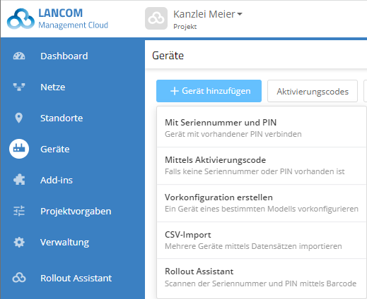 1. Öffnen Sie die Ansicht Geräte in der LANCOM Management Cloud und betätigen die Schaltfläche Neues Gerät hinzufügen und wählen anschließend die gewünschte Methode, hier Mittels Aktivierungscode.