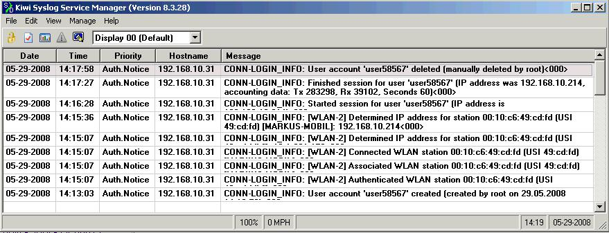5. Starten Sie das Auswertungsprogramm auf Ihrem SYSLOG Server (z. B. "Kiwi"). Sobald das Programm gestartet ist, zeichnet es das Anlegen und Löschen von neuen Public Spot-Benutzern sowie die An- und Abmeldungen von Public Spot-Benutzers auf.