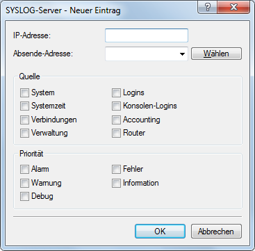 3. Fügen Sie einen neuen Eintrag hinzu. Definieren Sie dazu die IP-Adresse des Rechners, auf dem der SYSLOG-Client installiert ist (z. B. 192.168.10.237), und geben Sie die Quelle (Logins, Accounting) sowie die Priorität (Information) an.