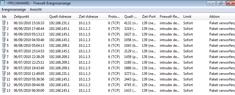 Über lassen Sie sich im LANmonitor die Firewall-Ereignisse eines markierten Geräts anzeigen. Die Firewall-Ereignisanzeige listet die letzten 100 Aktionen der Firewall auf. Die angezeigten Detailinformationen und ihre Erläuterungen sind identisch mit denen der IPv4-Firewall.