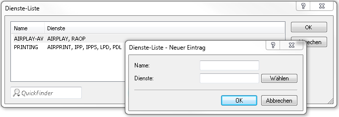 Erstellen Sie in dieser Tabelle eine Liste aus Bonjour-Diensttypen, die in der Bonjour-Netzwerkliste verwendet werden kann.