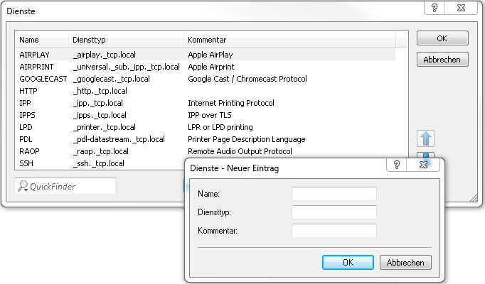 In dieser Tabelle definieren Sie die Typen von Bonjour-Diensten, die in der Dienste-Liste verwendet werden können. Es stehen Ihnen folgende weitere Einstellungsmöglichkeiten zur Verfügung: