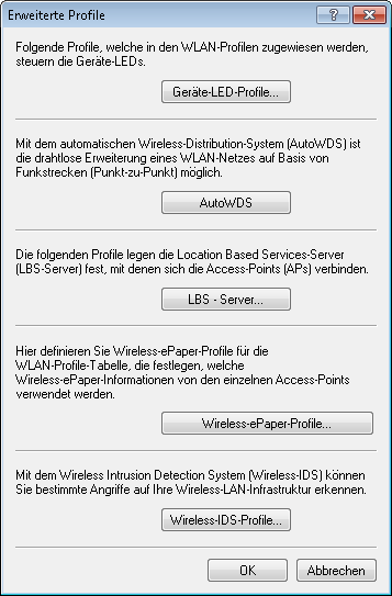 Um ein Profil für das Wireless Intrusion Detection System (WIDS) mit LANconfig zu konfigurieren, wechseln Sie in die Ansicht WLAN-Controller > Profile und klicken Sie auf Erweiterte Profile.