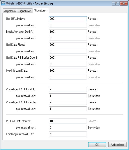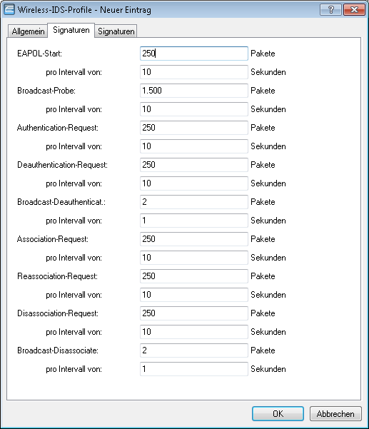 Auf den Reitern "Signaturen" konfigurieren Sie die Grenzwerte und Zeitintervalle (Datenpakete pro Sekunde) der verschiedenen Alarm-Funktionen des WIDS. Diese Werte regeln, wann das WIDS Warnungen generiert.