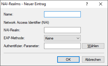 - Geben Sie hier den Realm für das Wi‑Fi-Netzwerk an. Der NAI-Realm selbst ist ein Identifikationspaar aus einem Benutzernamen und einer Domäne, welches durch reguläre Ausdrücke erweitert werden kann. Die Syntax für einen NAI-Realm wird in RFC 2486 definiert und entspricht im einfachsten Fall <username>@<realm>; für user746@providerX.org lautet der entsprechende Realm also providerX.org.