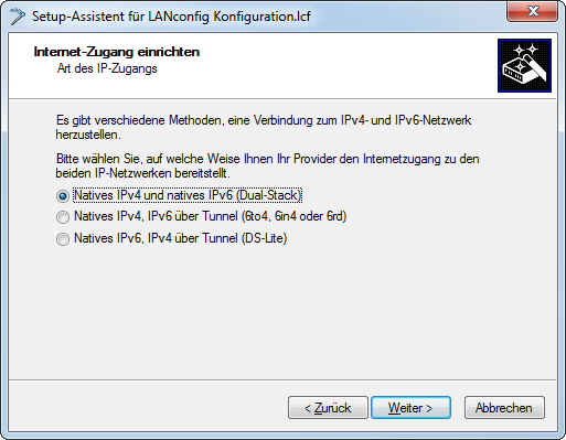 • Natives IPv4, IPv6 über Tunnel: Starten Sie den Assistenten zur Konfiguration eines 6to4-, 6in4- oder 6rd-Tunnels.