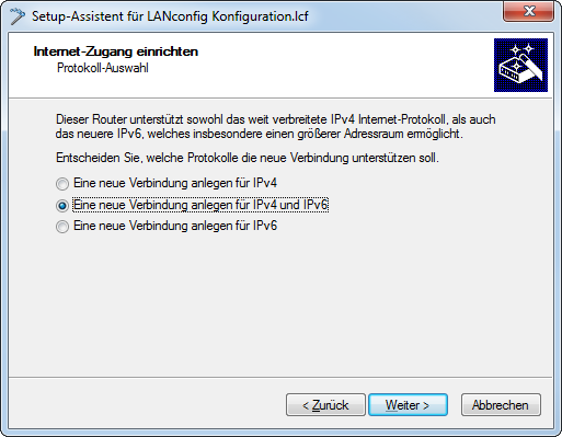 Wenn Sie ein neues Gerät angeschlossen, aber noch nicht konfiguriert haben, haben Sie die Möglichkeit per Setup-Assistent IPv4- und IPv6-Verbindungen herzustellen.