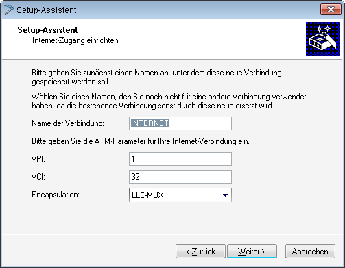 Wenn Sie den Internet-Zugang alternativ z. B. über eine PPPoE-Verbindung einrichten wollen, geben Sie zusätzlich noch die entsprechenden ATM-Parameter ein.