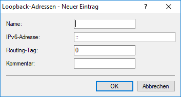 In der Tabelle Loopback-Adressen lassen sich IPv6-Loopback-Adressen festlegen. Das Gerät sieht jede dieser Adressen als eigene Adresse an, die auch dann verfügbar ist, wenn z. B eine physikalische Schnittstelle deaktiviert ist.