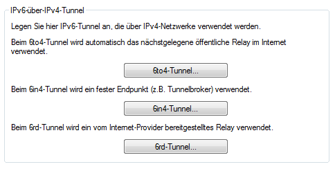 In der Konfiguration Tunnel legen Sie über 3 Schaltflächen IPv6-Tunnel an, die über IPv4-Netzwerke verwendet werden. Diese benötigen Sie, um den Zugang zum IPv6-Internet über eine IPv4-Verbindung herzustellen.
