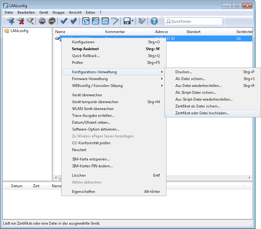 Verbindung ab. Der Zertifikatsupload erfolgt entweder durch LANconfig oder WEBconfig. In LANconfig gehen Sie dazu wie folgt vor: