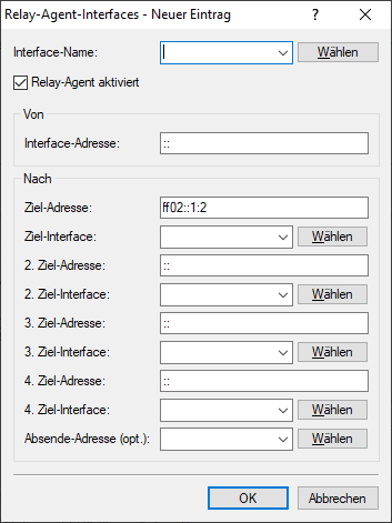 - Das Ziel-Interface, über das der übergeordnete DHCPv6-Server oder der nächste Relay-Agent zu erreichen ist. Die Angabe ist zwingend erforderlich, wenn unter der Ziel-Adresse eine linklokale Multicast-Adresse konfiguriert wird, da linklokale Multicast-Adressen immer nur auf dem jeweiligen Link gültig sind.