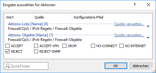 - Bestimmt die Aktion, die die Firewall bei gültiger Regel ausführen soll. Über Wählen können Sie aus