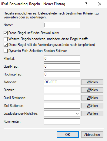 Über die Schaltfläche IPv6-Forwarding-Regeln legen Sie Regeln fest, nach denen die IPv6-Firewall den weiterzuleitenden Datenverkehr behandeln soll.