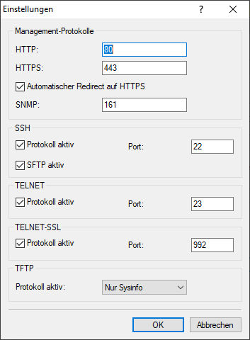 Nach einem Klick auf Einstellungen können Sie die folgenden Protokolle aktivieren und den jeweils verwendeten Port konfigurieren: