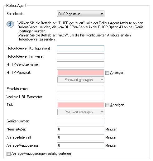 Anmerkung: Die Betriebsart "DHCP-gesteuert" überschreibt manuell konfigurierte Attribute nicht. Somit ist eine umfangreiche Vorkonfiguration möglich, bei der das Gerät z. B. nur die vom DHCP-Server übertragene aktuelle Kontaktinformation des Rollout-Servers verwendet (Adresse, Login-Daten).