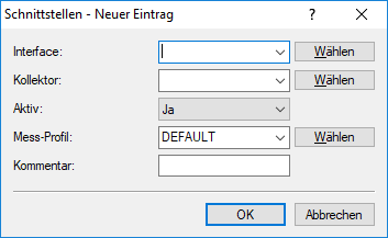- Logische Schnittstelle, auf der NetFlow / IPFIX aktiviert werden soll. Mögliche Werte: IPv4-, IPv6-LAN-Schnittstellen, Gegenstellen, IPv6-RAS-Template. Für IPv4-Gegenstellen kann eine Wildcard verwendet werden, z. B. Firma*