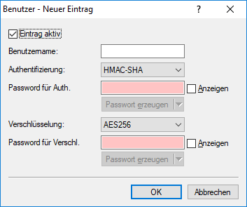 Neben den am Gerät registrierten Administratoren ist der Zugriff auch für einzelne Nutzer möglich. Hier konfigurieren Sie die Einstellungen für Authentifizierung und Verschlüsselung für diese Anwender bei Nutzung von SNMPv3.