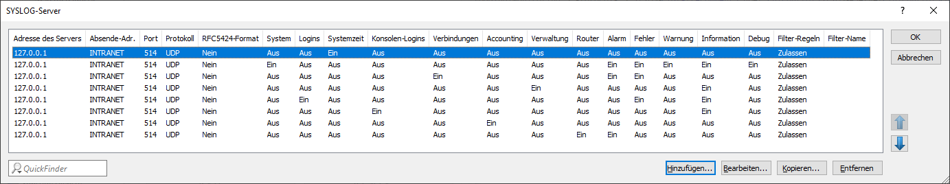 Wenn Sie alle Parameter definiert haben, bestätigen Sie die Eingaben mit OK. In der SYSLOG-Tabelle erscheint der SYSLOG-Client mit seinen Parametern.