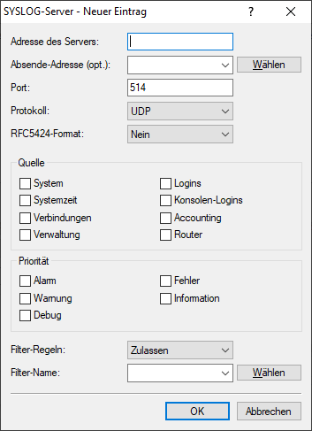 Werden die Syslog-Meldungen an einen oder mehrere Server übertragen, indem Einstellungen für den Empfang bestimmter Meldungen konfiguriert wurden, so werden alle konfigurierten Meldungen mit der konfigurierten Quelle und Priorität an die Server übertragen. Mitunter ist es jedoch wünschenswert, bestimmte Meldungen für die Server auszufiltern, nur bestimmte Meldungen überhaupt zu schicken oder auch deren Quelle und Priorität zu verändern, falls sie im Serverlog eine andere Gewichtung erhalten sollen. Der Syslog-Filter erlaubt es, Meldungen in Abhängigkeit von Quelle, Priorität und / oder Meldungstext zu filtern. Dabei stellen Sie hier ein, ob die Meldungen, die über den im folgenden Feld eingestellten Filter bestimmt werden, zugelassen oder abgelehnt werden.