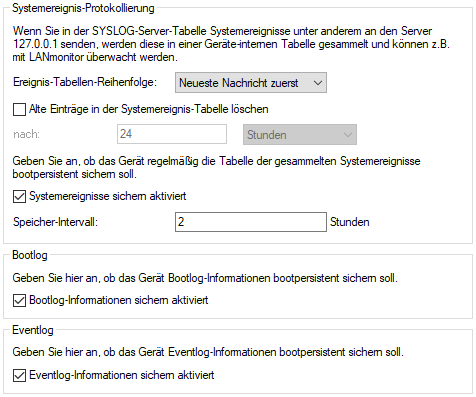 - SYSLOG: Systemereignisse sichern aktiviert Über den Eintrag Speicher-Intervall geben Sie die Zeitspanne in Stunden an, nach der die SYSLOG-Systemereignisse bootpersistent gesichert werden.
