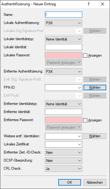 - Digitale-Signatur: Verwendung von konfigurierbaren Authentifizierungsmethoden mit digitalen Zertifikaten nach RFC 7427. Dieses Verfahren ist ein erweiterbares und flexibles Authentifizierungsverfahren, bei dem z. B. Padding- und Hash-Verfahren frei konfiguriert werden können.