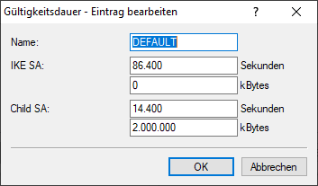 In dieser Tabelle definieren Sie die IKEv2-Rekeying-Parameter. Es existiert ein Standardeintrag "DEFAULT" mit gängigen Einstellungen.