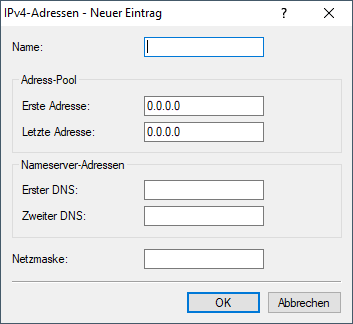 Anmerkung: Der hier definierte Adress-Pool sollte außerhalb der definierten Netze liegen. Andernfalls müssen Sie Proxy-ARP aktivieren.- Nameserver-Adressen