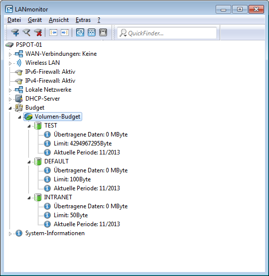 Eingerichtete Volumen-Budgets lassen sich komfortabel mit LANmonitor im Zweig Budget auswerten und verwalten.