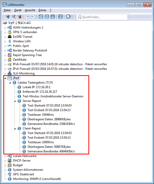 Das letzte iPerf-Testergebnis lässt sich auch im LANmonitor unter "iPerf" anzeigen. Dabei ist es egal, ob das Gerät eine Verbindung gestartet hat oder sich von extern verbunden hat. Die Verbindungsart "Test-Modus" zeigt den verwendeten Modus entsprechend an: