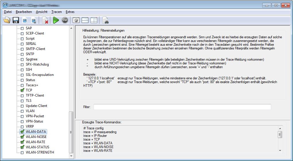 Zu jedem Trace können Sie außerdem einen Filter eingeben. Um z. B. nur die IP-Adresse einer bestimmten Workstation anzuzeigen, geben Sie die entsprechende IP-Adresse als Filter des IP-Router-Traces ein. Um mehr über die Filterfunktion zu erfahren, lesen Sie das Kapitel Trace-Ausgabe filtern.