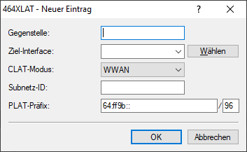 - Ist die Internetverbindung eine Mobilfunkverbindung (WWAN), so muss der CLAT-Modus WWAN verwendet werden. Das CLAT-Präfix wird aus dem /64 WAN-Präfix gebildet. Die Subnet-ID muss 0 oder leer sein. In der IPv4-Routing-Tabelle muss für die WAN-Verbindung NAT aktiviert werden.