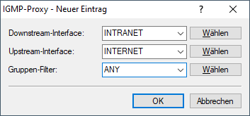 - Downstream-Interface: Interface-Name, auf dem IGMP-Clients Gruppen beitreten können und IGMP-Nachrichten vom Proxy empfangen werden. Konfigurieren Sie hier den Namen des Client-Netzwerks, z. B. "INTRANET".