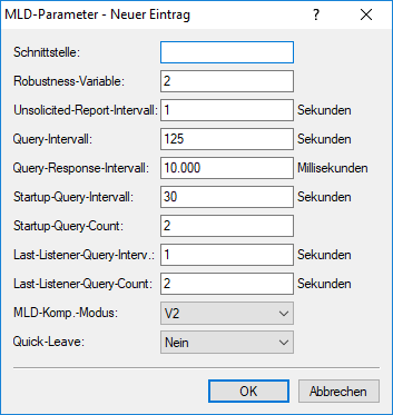 - MLD-Version, in der das Gerät in der Rolle als Multicast-Router arbeitet. Mögliche Werte: Aus, V1, V2 (Default: V2)