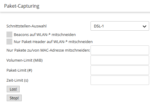 - Mit diesem Auswahlmenü bestimmen Sie die Schnittstelle, deren Datenpakete aufgezeichnet werden.