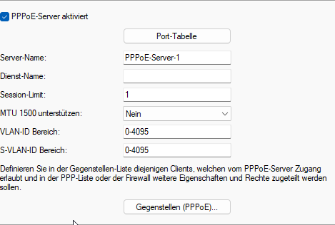 Vergeben Sie unter Server-Name einen Namen für den PPPoE-Server. Dieser wird den PPPoE-Clients zur Identifizierung