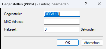 Setzen Sie die Haltezeit auf 0. Damit baut der PPPoE-Client die Verbindung aktiv auf, der Server baut diese