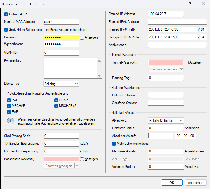 Legen Sie im RADIUS-Server unter einen neuen Benutzer mit den folgenden Attributen an:
