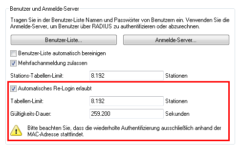 Im Feld Auto-Re-Login-Tabellen-Limit bestimmen Sie die Anzahl der Clients (maximal 65536), die die Funktion Re-Login nutzen dürfen.