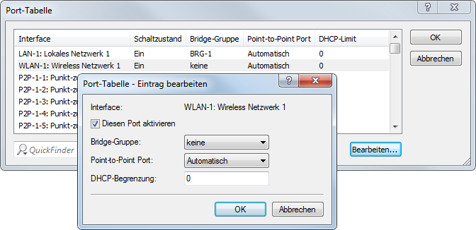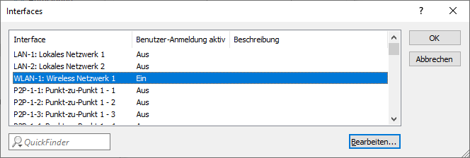 Mit der Auswahl einer Schnittstelle legen Sie fest, auf welchen Schnittstellen die Benutzer-Anmeldung aktiviert wird. Zur Auswahl stehen neben den logischen WLAN-Interfaces, über die sich Public Spot-Benutzer direkt anmelden können, auch die logischen LAN-Interfaces (LAN-1 etc.) und die Point-to-Point-Strecken (P2P-1 etc.). Über LAN- und P2P-Interfaces können Sie weitere Access-Points in den Public Spot eines anderen Gerätes einbeziehen. Wählen Sie für einen singulären Access-Point hingegen z. B. das logische WLAN-Interface WLAN-1.